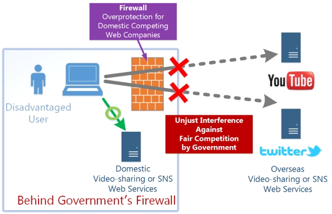 The government's firewall forces their people to use only domestic web services instead of those available around the world. Under such control, people cannot visit global web services which compete with domestic web services. In other words, such government provides unfair advantages to the few domestic web-service providers at the cost of convinience that would have satisfied the users in that country. Ultimately, such government's overprotection will cause decline in public interests, as most people in such country are kept away from the worldwide, valuable web services.