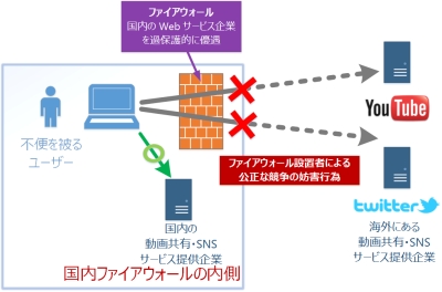 サイトを国内から閲覧できなくし、国内ユーザーに対して、国内企業が提供する他の競合サービスを使用するよう強要します。つまり、国内のユーザーに不便を強いることにより、国内の