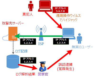アドレスを発信元とした通信の発信者とみなされます。最近、日本では無実の人のコンピュータに遠隔地にいる犯罪者が遠隔操作ウイルス