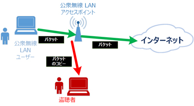 スプーフィングなどの攻撃を行うことにより盗聴が可能です。さらに、喫茶店や空港などに設置されている無料の無線 LAN