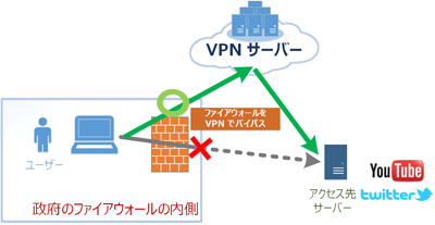 サービスへのアクセスをフィルタするための政府のファイアウォールが設置されている環境であっても、YouTube、Twitter